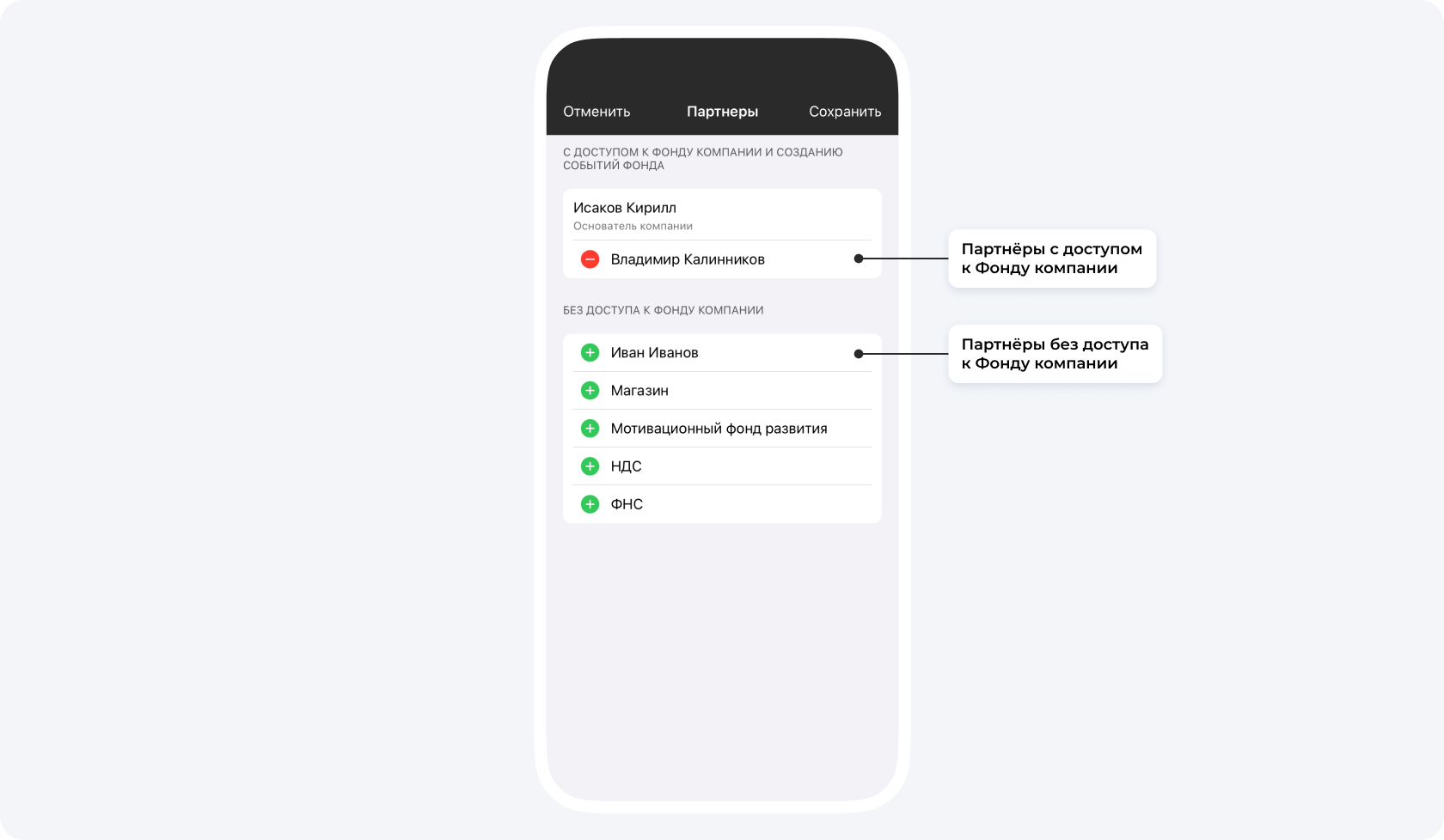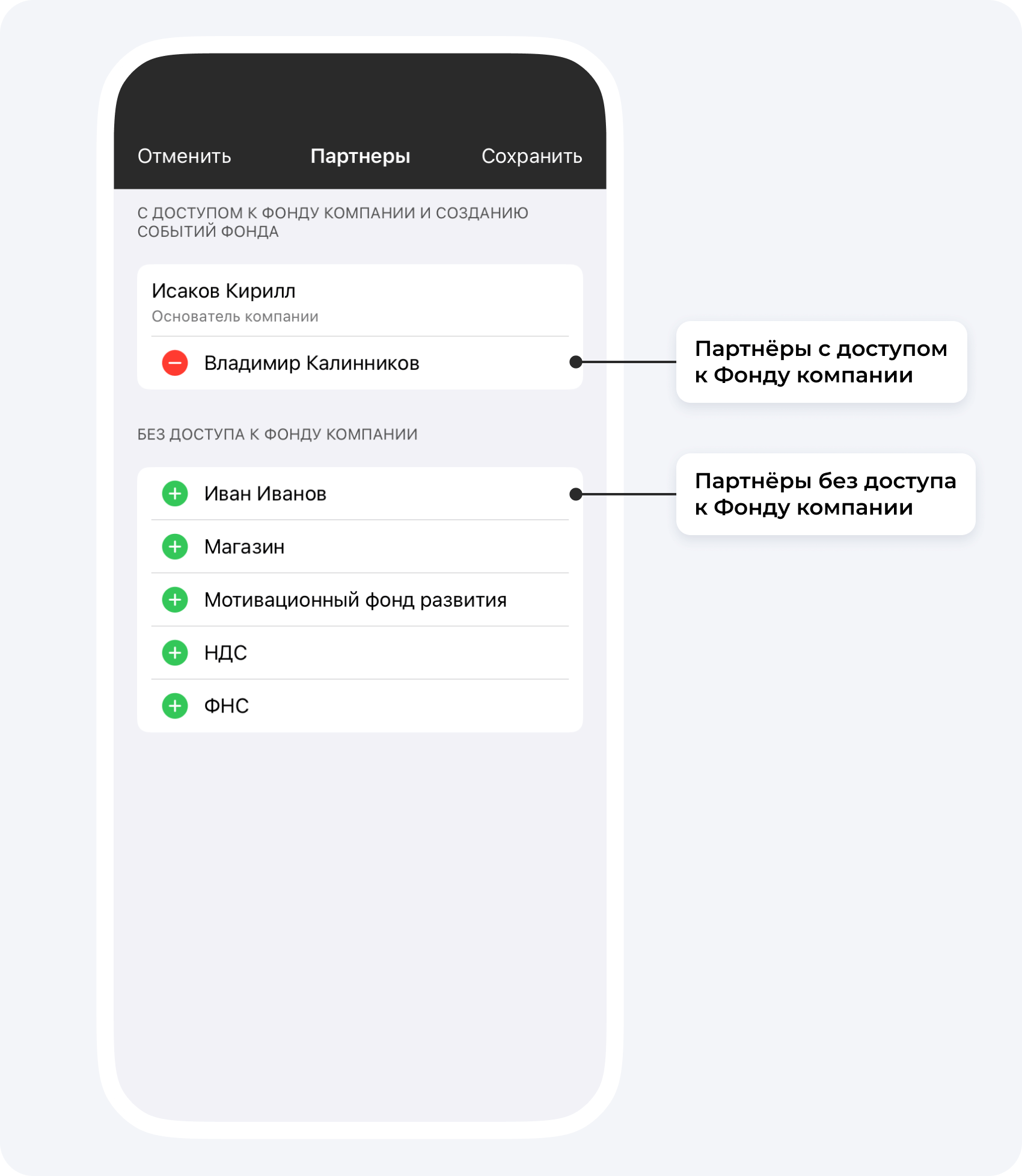 Вы сможете управлять списком Партнёров в Фонде Компании. Добавляя контрагента в Фонд, вы делаете его полноценным партнером, от которого зависит развитие компании.