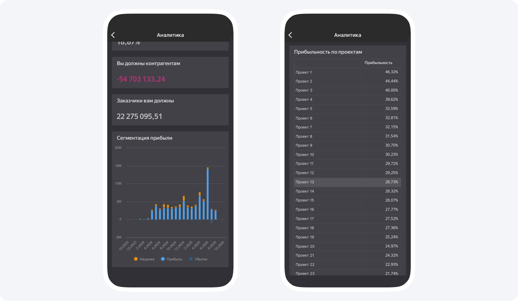 Таблицы и графики в Приложении 101 обновляется буквально в ту же секунду, как вы отредактировали какие-либо данные. Чем дольше вы ведете учет, чем подробнее у вас статьи расходов. Чем больше проектов вы провели через приложение, тем более информативной становится бизнес-аналитика.